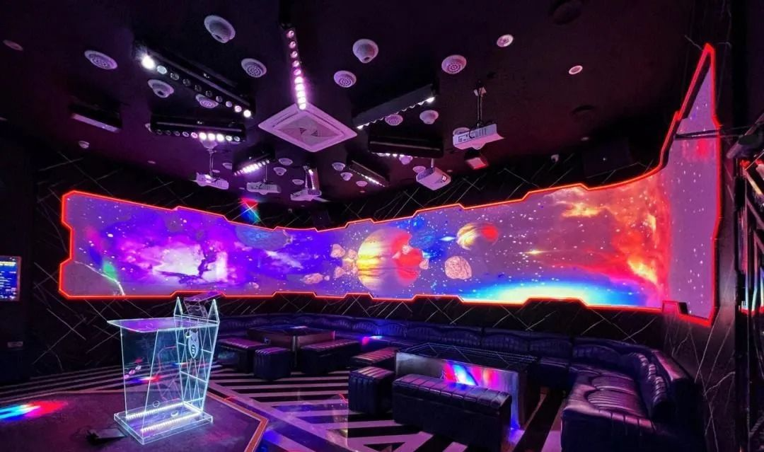 包厢墙面可以投影出各种主题的场景,模拟海洋、森林、草原、宇宙等多种场景,打破了传统KTV包间像是简单的一面墙,一部电视,配合有色调单一的激光灯,千篇一律,实现了柔性装修。