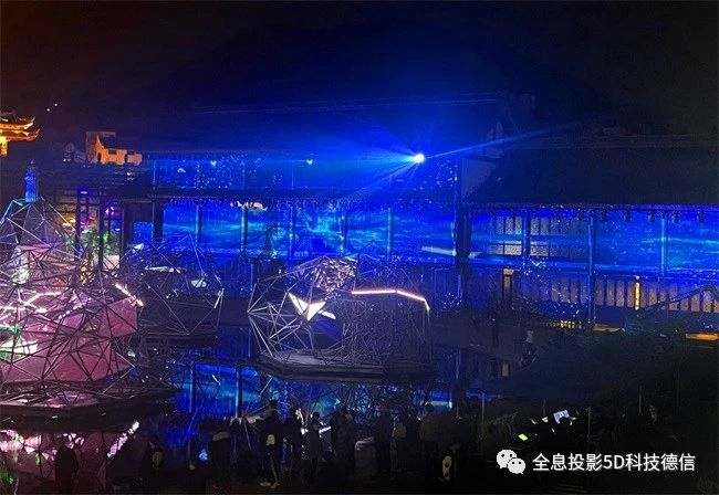 演出在由三座楼阁包围的露天舞台进行,以“渔夫撒网”为开端,演员们陆续根据演出情节进场,身着渔夫、海女的装扮,手持灯笼、鱼篓,在波光粼粼好似变幻莫测的大海的水面舞台上,翩然起舞。同时,三座楼阁也配合着演出的进行不断变换投影画面,这正好与中央的水面舞台构成了一个全场景360度全感官的沉浸式演出空间。