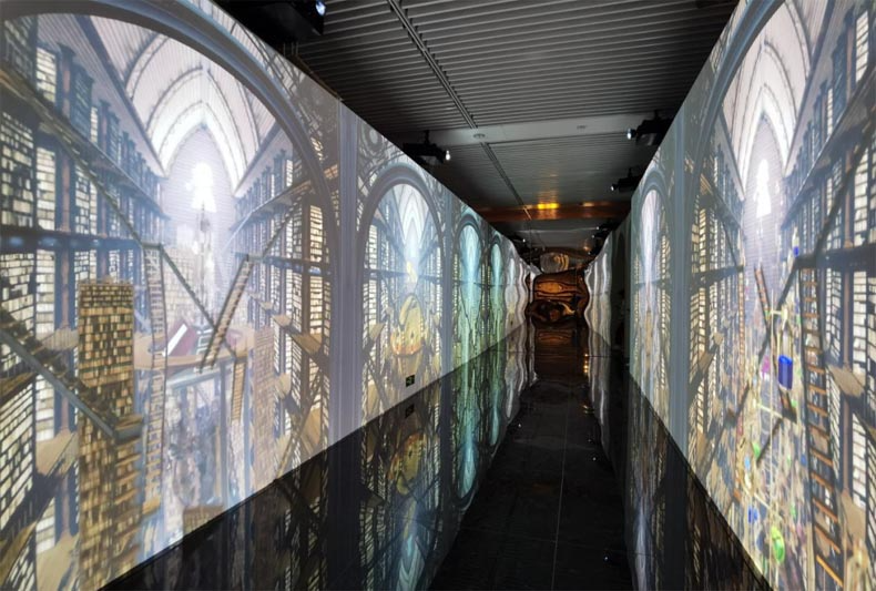 在完成了大量互动体验环节后,一条光影长廊的出现令每位侦探初学者感叹于刑侦学的博大精深。5台激光工程投影机配合镜面的反射呈现出了一座仿佛无边际的藏书阁,不多时画面又切换至书架间的身体结构图、动物骨骼图、植被生长周期特征图等高清图像,目不暇接间令人对福尔摩斯先生的崇敬之情又加深了几分。